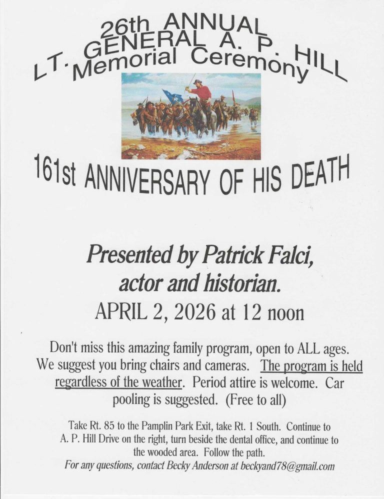 Patrick Falci, the actor who portrayed General A.P. Hill in the movie "Gettysburg" appeared in period dress and delivered a wonderful program telling the story of General Hill's life and the circumstances leading to his death. This event is always free and open to the public.